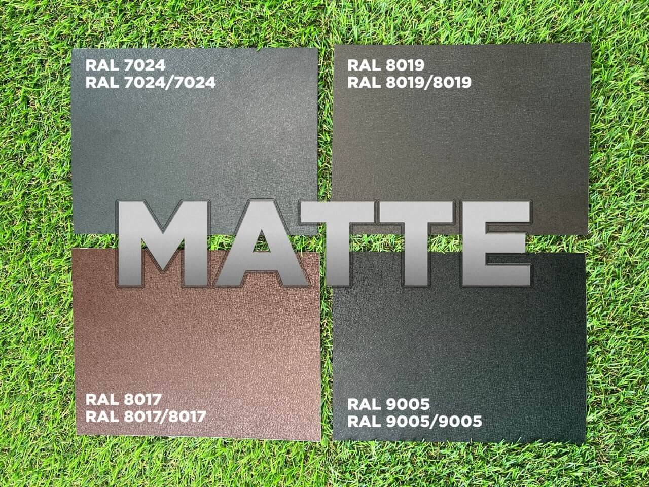 Одним из ярких представителей матового полиэстера является покрытие MATTE. Линейка представлена в четырех оттенках: RAL8017 Шоколад, RAL8019 Темный Шоколад, RAL7024 Серый Графит и RAL9005 Черный. Эти спокойные выдержанные цвета прекрасно совместимы с такими архитектурными стилями, как хай-тек и минимализм. Для заказа доступны два варианта покрытия: одностороннее, т.е. окрашивание только с лицевой стороны и двустороннее окрашивание как с лицевой, так и с внутренней стороны.