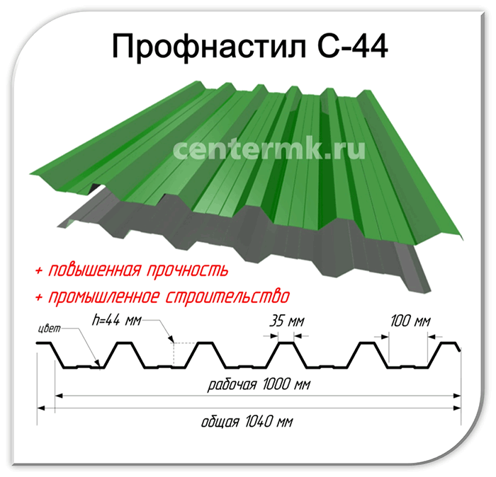 Профнастил C-44 оцинкованный 1040х1000">Профнастил С-44 высотой 44 мм, по широкому ребру дополнительно проложена широкая борозда. С-44 обладает повышенной прочностью и используется для промышленного строительства: скатные кровли, заборы и любые ограждения, облицовка стен. С-44 в отличие от НС-35 нельзя применять в качестве несущих покрытий.