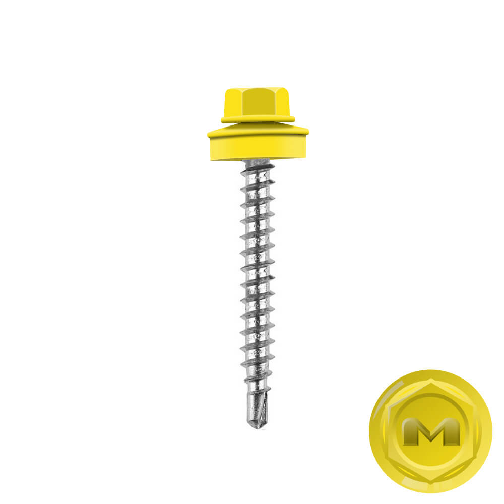 Кровельные саморезы Daxmer (Даксмер) по дереву цветом RAL1018 Желтый 4,8*35мм окрашиваются УФ-стойкой полиэфирной порошковой краской. Цинковое антикоррозийное покрытие обеспечивает длительный срок службы саморезов (не менее 25 лет). Специальная металлическая шайба с ЕРDМ - уплотнителем обеспечивает плотное прилегание профилированного металла (кровли) к деревянной обрешетке, а также препятствует попаданию влаги.