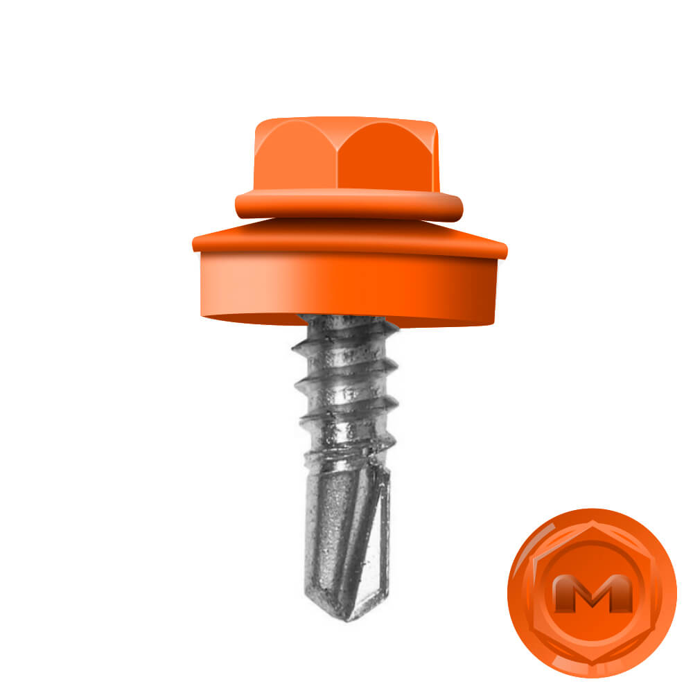 Кровельные саморезы Daxmer (Даксмер) по металлу цветом RAL2004 Оранжевый Апельсин 5,5*19мм имеют частую резьбу, а специальная металлическая шайба с ЕРDМ-уплотнителем 2,8 мм обеспечивает плотное прилегание профилированного металла (кровли) к обрешетке, а также препятствует попаданию влаги. Также ЕРDМ-уплотнитель защищает от перепада температур (за счет высокого содержания каучука), который адаптируется под окружающую температуру и не позволяет кровле или забору «гулять», плотно прижимая листы к основанию.