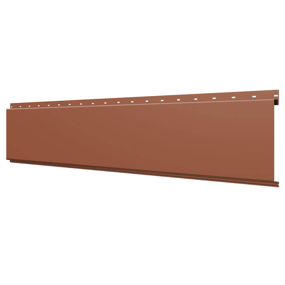 Линеарная потолочно-стеновая панель ГЛАДКАЯ цвет RAL8004 Терракотовый применяется в качестве софитов для подшивы крыши, наружной и внутренней отделки потолков, стен, фронтонов фасада дома в Саранске.