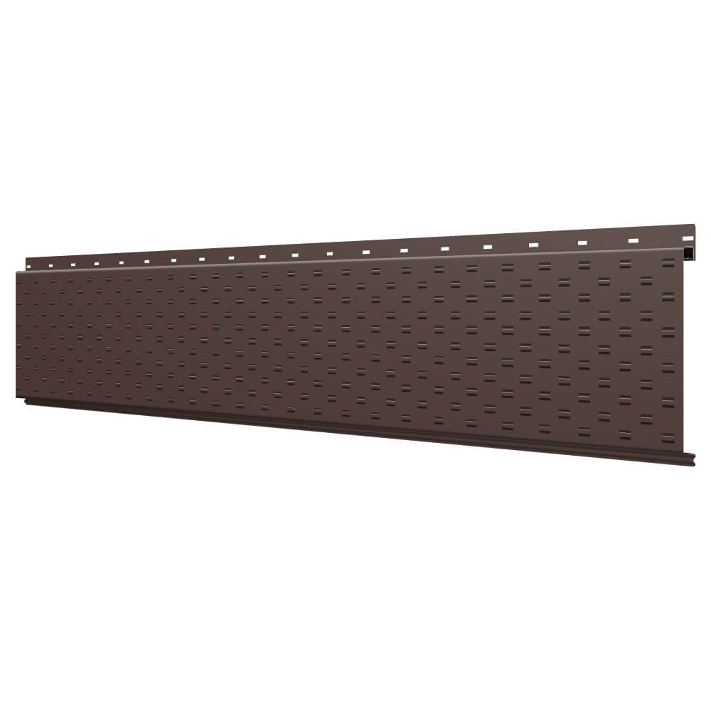 Линеарная потолочно-стеновая панель с ПЕРФОРАЦИЕЙ для вентиляции цвет RAL8017 Шоколад применяется в качестве софитов для подшивы крыши, наружной и внутренней отделки потолков, стен, фронтонов фасада дома в Саранске.