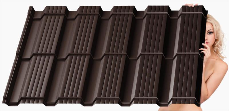 Металлочерепица Каскад имеет изысканный строгий дизайн профиля: прямой, ровный рисунок и декоративные канавки. Благодаря этому внешний вид металлочерепицы «Каскад» на кровле крыши приобретает оригинальную форму плитки классического шоколада. Кроме эстетического эффекта, такая форма профиля придает кровельному покрытию дополнительную стойкость к продольной нагрузке.