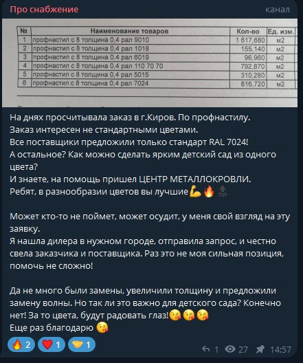 На днях просчитывала заказ в г.Киров. По профнастилу. Заказ интересен не стандартными цветами. Все поставщики предложили только стандарт RAL 7024! А остальное? Как можно сделать ярким детский сад из одного цвета? И знаете, на помощь пришел ЦЕНТР МЕТАЛЛОКРОВЛИ. Ребят, в разнообразии цветов вы лучшие!!!