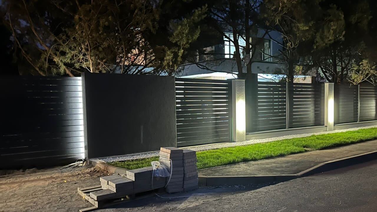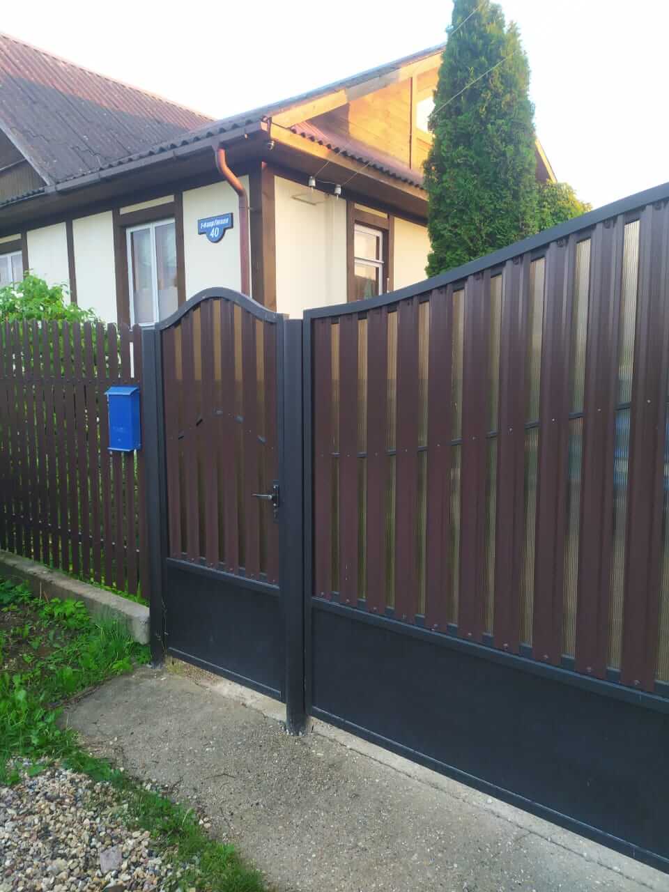 Ламели поставили Еврожалюзи цвет графит. Вот так получился забор на фоне белого кирпича с мраморной крошкой. Интересные дизайнерские колпаки сделали специально под наш проект, очень круто! Парапеты, калитка - все как родное новое встало.