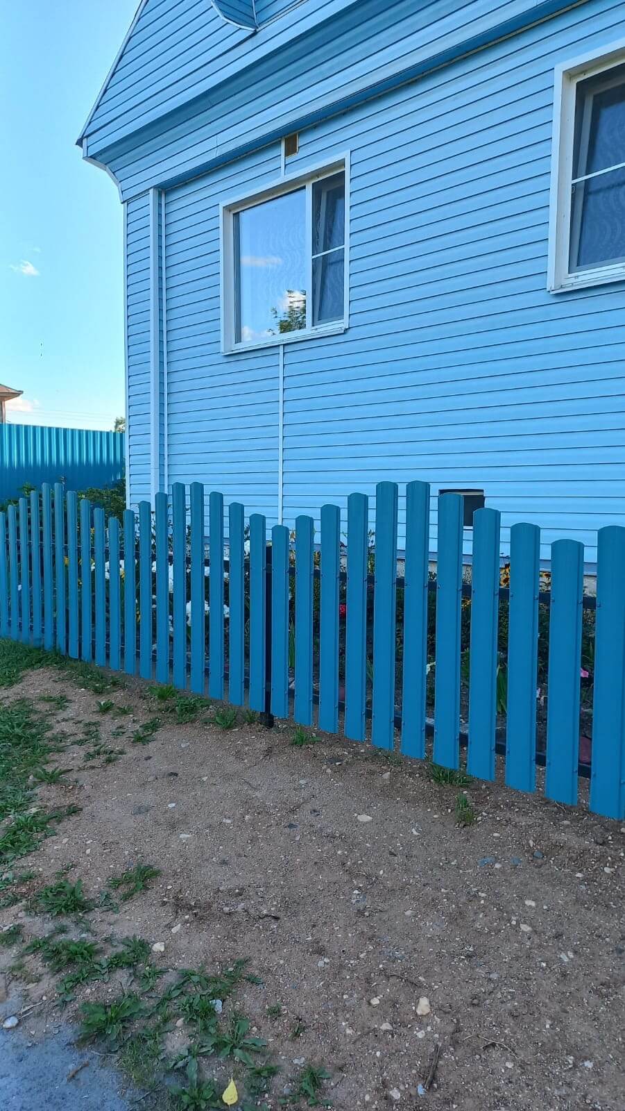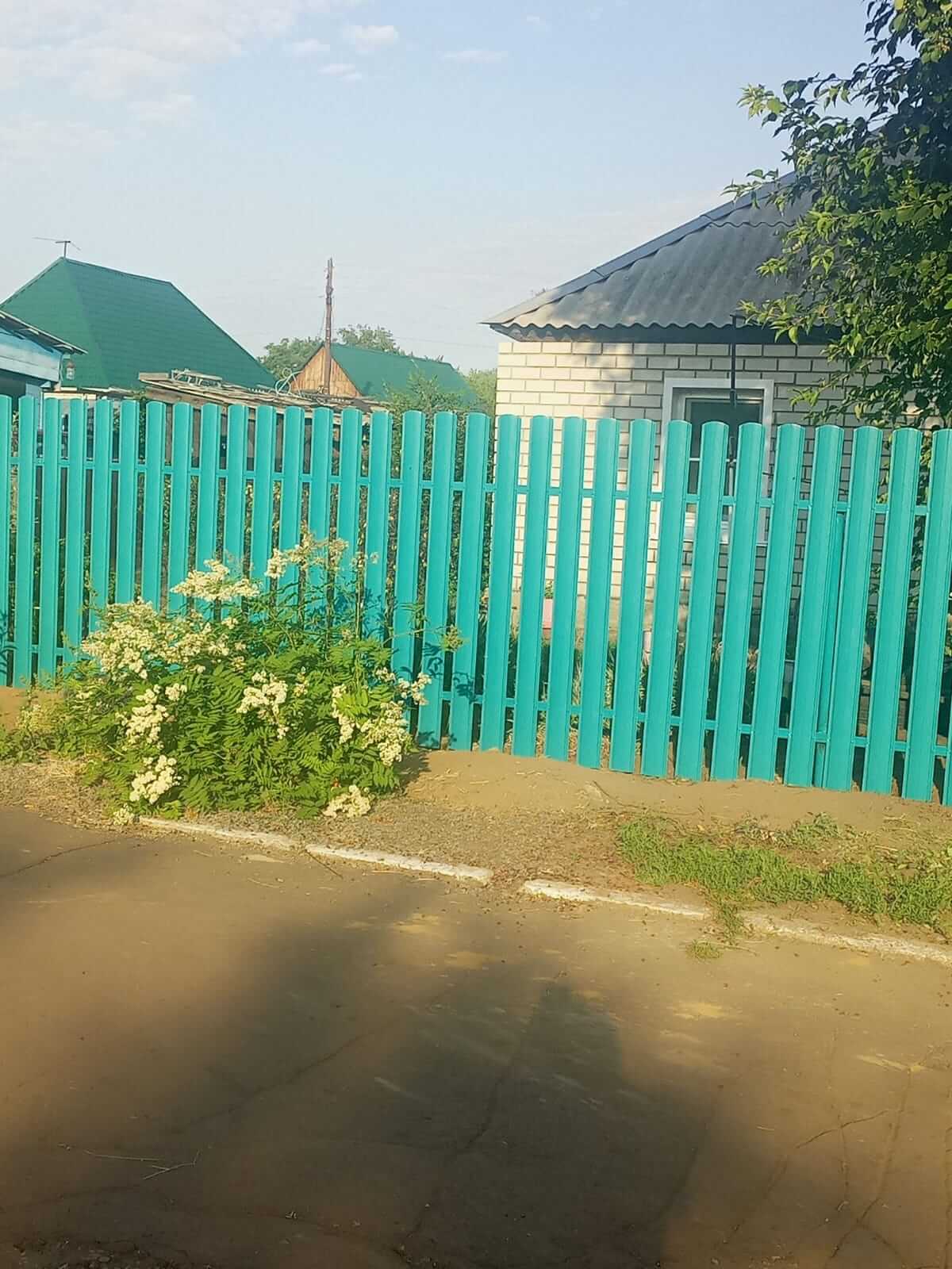Чем хороша компоновка секции забора из металлического штакетника волной, если какие то столбы вылезут, на ровном будет видно недочеты, а волна все скрывает - советую!