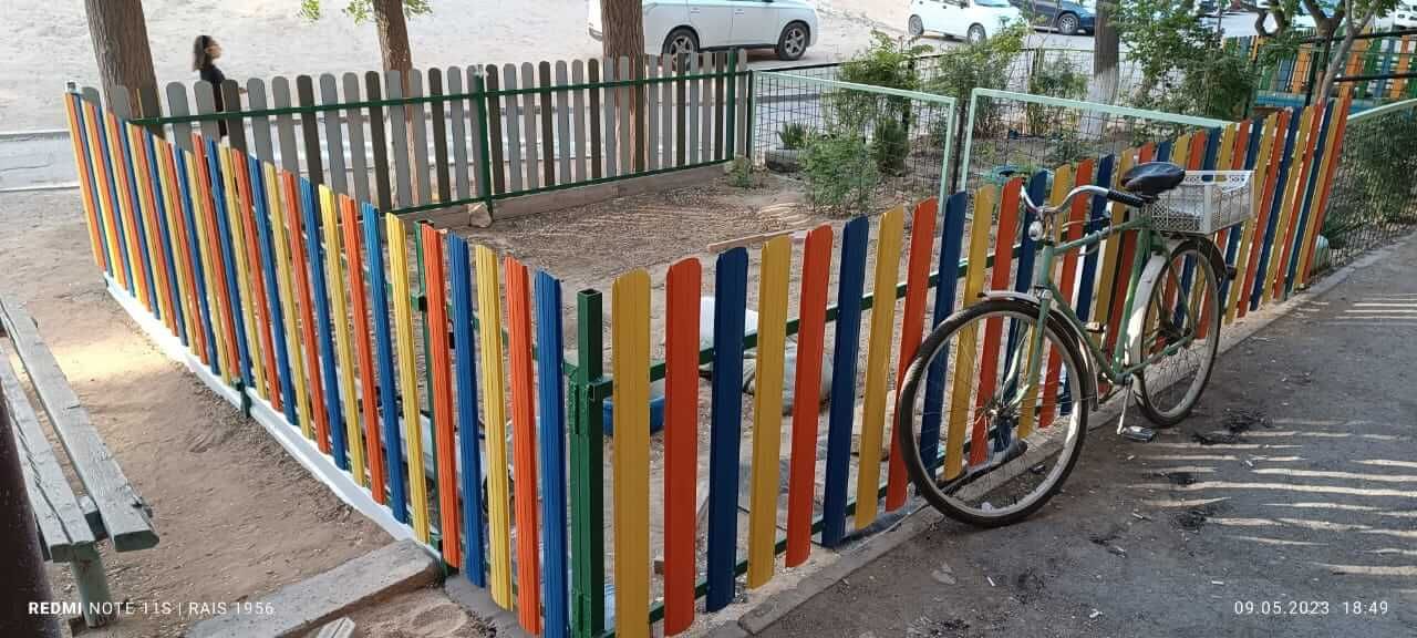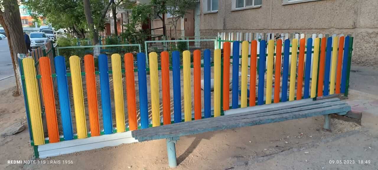 ✅ Забор установлен в городе: Актау (Казахстан) ✅ Вид секции: горизонт ✅ Профиль штакетника: полукруглый 110мм ✅ Цвет и покрытие: RAL1018 Желтый + RAL2004 Апельсин + RAL5005 Синий Сигнал