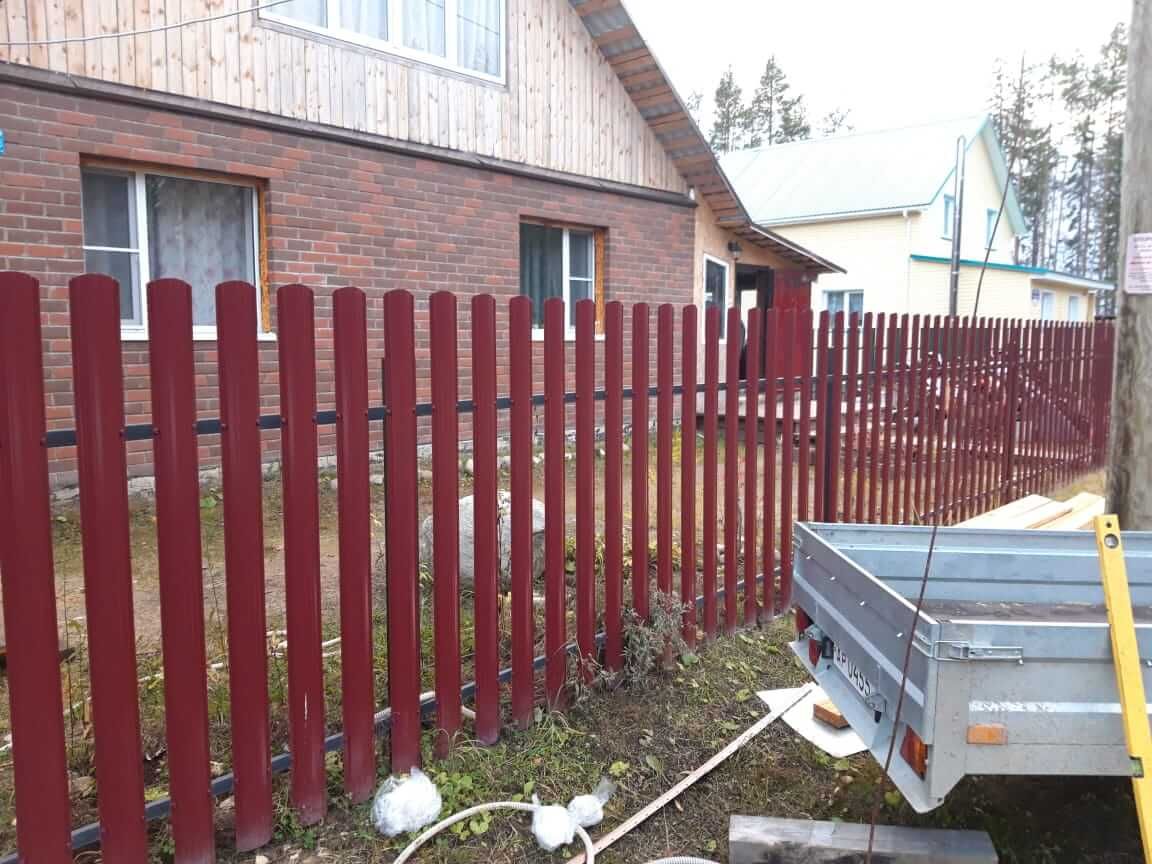 В данном случае использован евроштакетник полукруглый с покрытием стандарт полиэстер в цвете RAL 3005 Красное вино. Высота забора 1,6 метра.