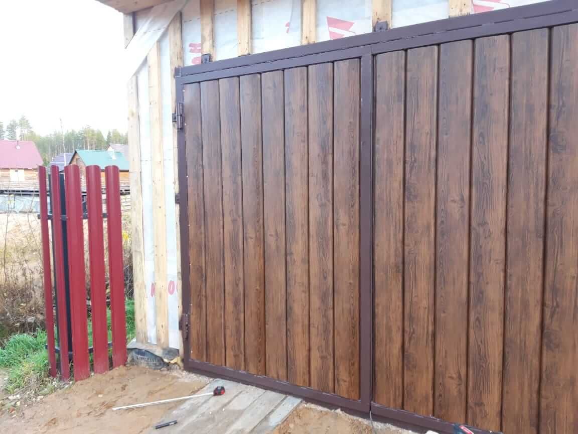 Ворота для гаража из металлосайдинга могут быть как распашными, так и откатными, и даже с автоматизированным приводом. Всё зависит от ваших предпочтений, это касается также ширины и высоты конструкции.