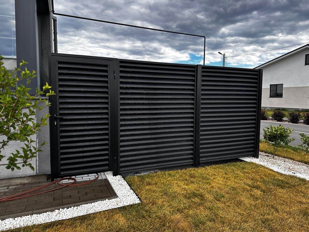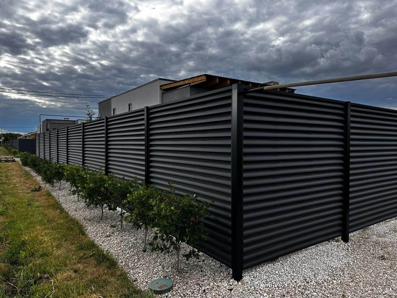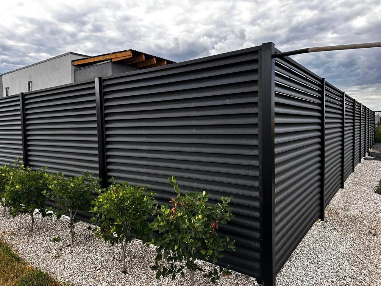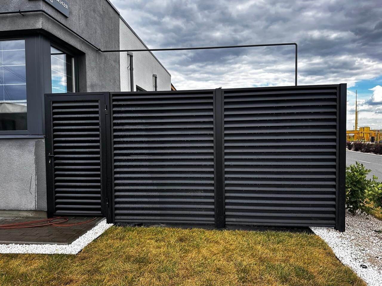 Секция забора жалюзи из ламелей еврожалюзи RAL9005-9005 МАТТЕ Черный с кирпичными столбами анфас двусторонний Вид спереди забор ламели еврожалюзи RAL9005-9005 МАТТЕ Черный матовый двусторонний Вид сзади забор ламели еврожалюзи RAL9005-9005 МАТТЕ Черный матовый двусторонний Ламели еврожалюзи RAL9005-9005 МАТТЕ Черный матовый двусторонний